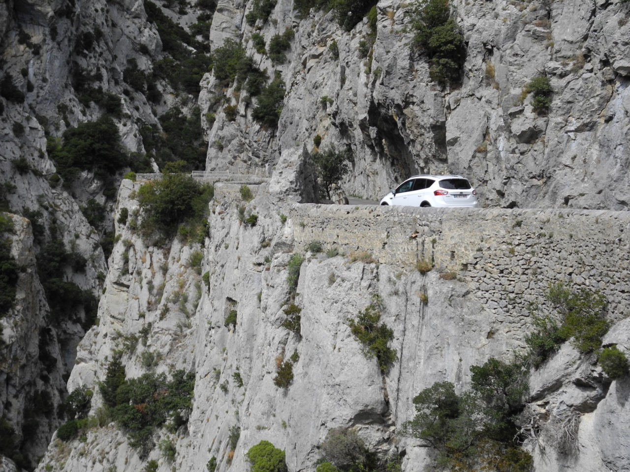 DSCN3138Enough of the generalities, here are the places I most enjoyed, of the 20–30 sights and cities we managed to visit. Many people pointed us to this dramatic, near vertical gorge with its grey limestone cliffs. One Guelph friend who had explored the area on bicycle warned, “not for the vertiginous.” Our approach was tentative, as I mentioned above, but once in the dramatic two-kilometre stretch through the steepest section, it was an absolute thrill. If the gorge is 400 metres from top to bottom (I’m guessing), then the road is carved from the limestone at the mid-point. I have no idea how they did that, in the 19th century. You can’t see the river below unless you get out of the car and peer gingerly over the edge. The peaks, high above, are similarly hard to view. And it’s narrow, with only periodic spots for passing every few hundred metres. I googled the history of the spectacular road, but my search turned up mostly YouTube videos of people biking, driving or canyoning (swimming, sort of) through the gorge with GoPro cameras mounted on their helmets (eg. motorcycle, canyoning). I was wowed, and it was only one stop on a day trip that had three major thrills (some beautiful villages in the pre-Pyrenees, and a mountain-top chateau ruin).