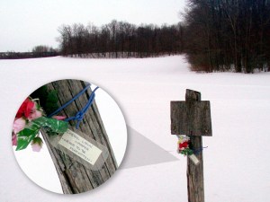 After I conducted my experiment at the Bayfield River bridge, I drove up the hill another half-kilometre to a snowy field. I was astounded to find a tiny makeshift memorial stapled to a wooden post on the side of the road, near the bush where her body was found. It read: “Cheryl Lynn Harper – never to be forgotten.” This was the winter of 2005; Harper died in the summer of 1959.