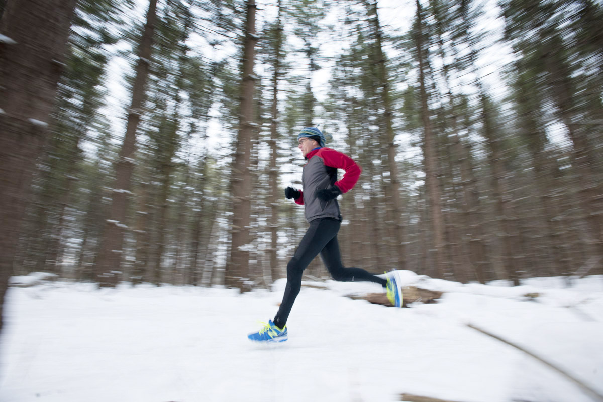 Dean spends 20 minutes shooting Paul and I at the trail barrier the owner has erected. Then we climb the hill on the return trail loop and we take turns running through a replanted pine forest while Dean clicks the shutter on his big camera, looking for a winter shot to complement the collection of running photos he has on display at the local running shoe store. It’s total fun and games, not a run at all. I’m not even sure what Dean is after, but the next day he sends me this shot, which perfectly captures the joy and freedom of winter trail running.