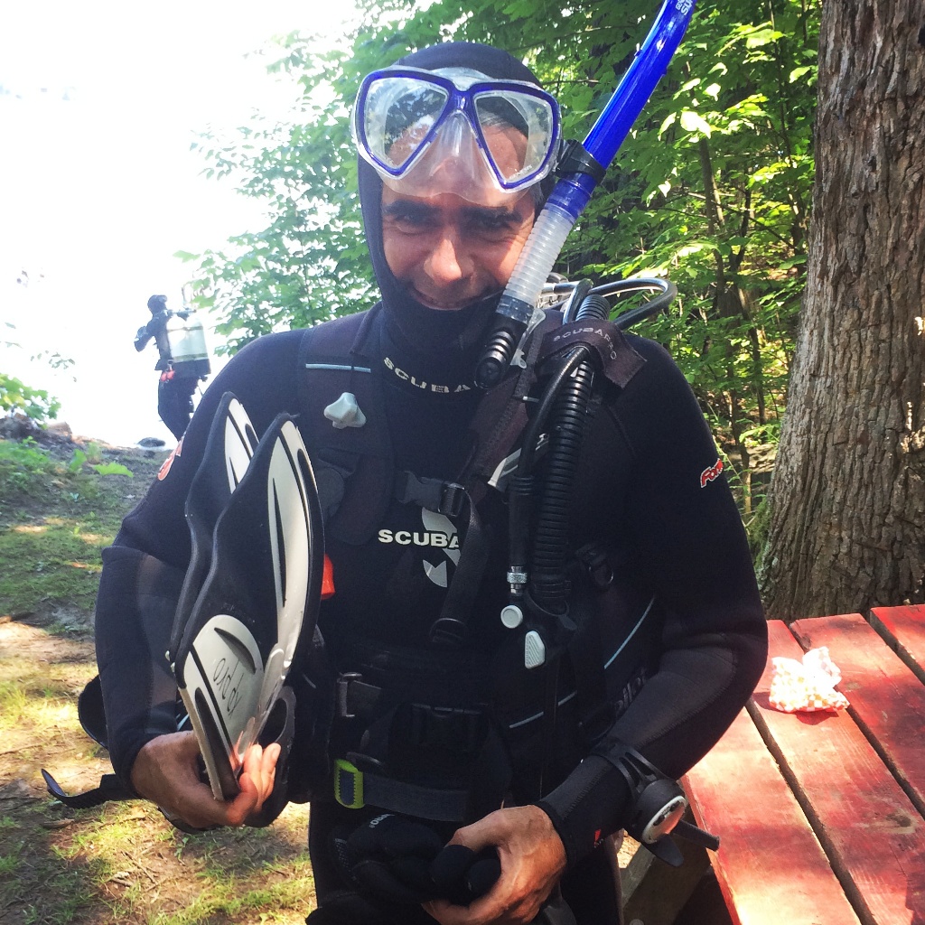 Getting suited up for my first open water scuba dive in the St. Lawrence