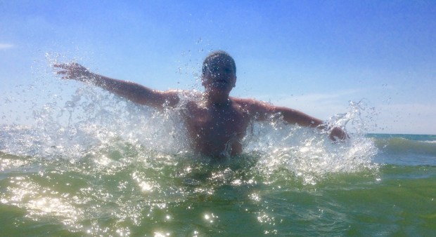 Kyle’s first time swimming in open water, in Lake Huron, July