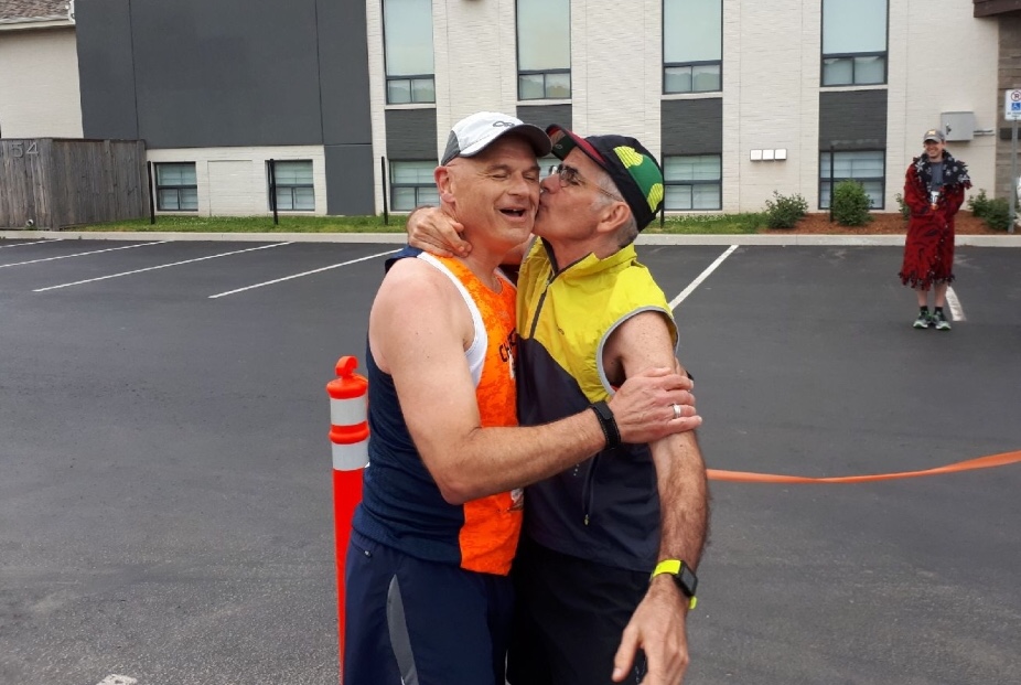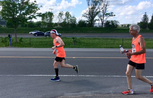 Cameron Mahon races in 30 degree heat, alongside the 401 highway near Bowmanville, with race support from Robert Winckler.