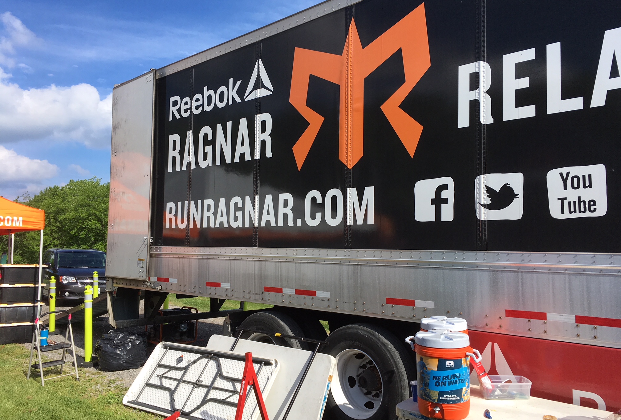 Ragnar provides the infrastructure, including a mobile phone app we use for navigation, and which they also use to send us last-minute instructions. They have two start line setups I notice: one in Cobourg for Van 1, and another in Bowmanville, about 60 kilometres down the road where Van 2 takes over. And the Cobourg crew then moves their stuff to Niagara Falls, to set up the finish line, using that semi-trailer in the photo above. Impressive logistics! Their graphics are snappy and humorous, and they’ve created a race culture that cleverly balances the sometimes opposing values of participation and competition. They do it all very well, and you won’t find many negative comments about the race series online.